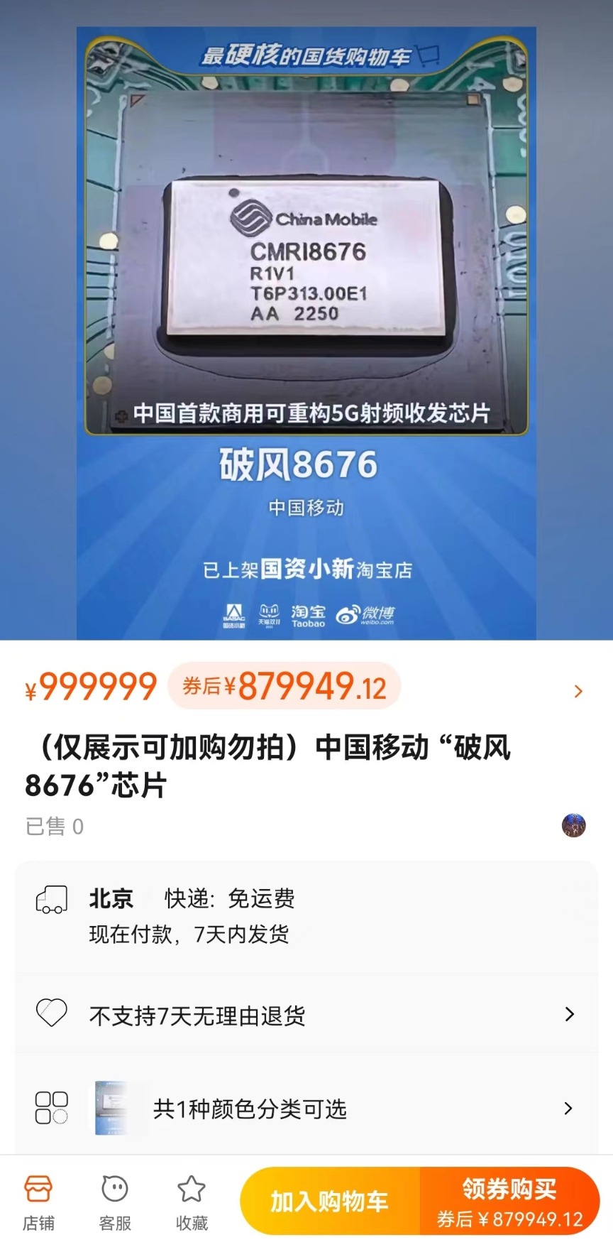 10月30日,第一财经记者发现一款编号为CMRI8676的5G芯片上架淘宝商城。商品图介绍称该款芯片名为“破风8676”股票配资和融资有区别吗,是“中国首款商用可重构5G频射收发芯片”,定价人民币999999元。这款芯片因独特的用途和“硬核”的定价被网友戏称为“双十一”期间最“硬核”的国货。